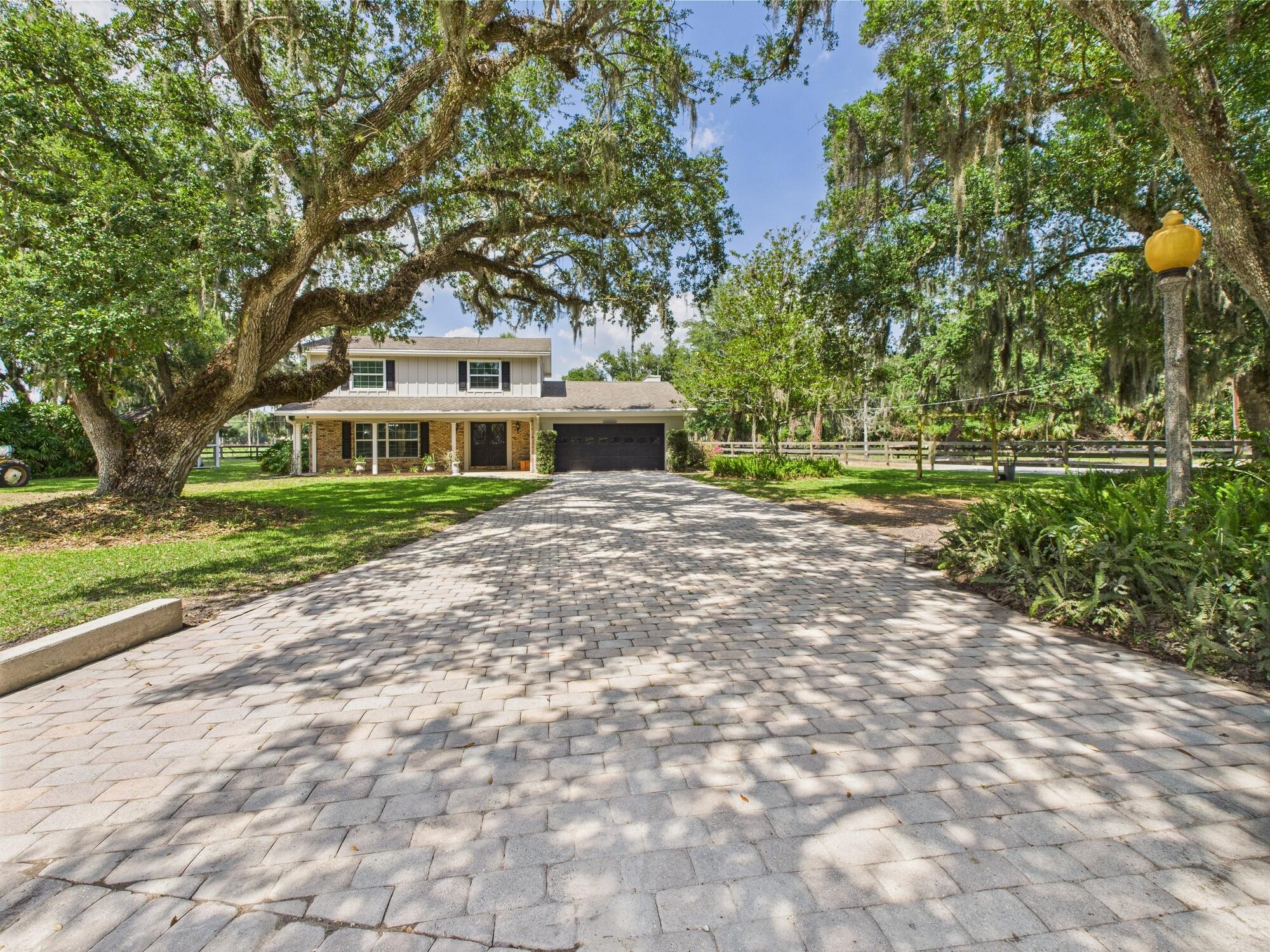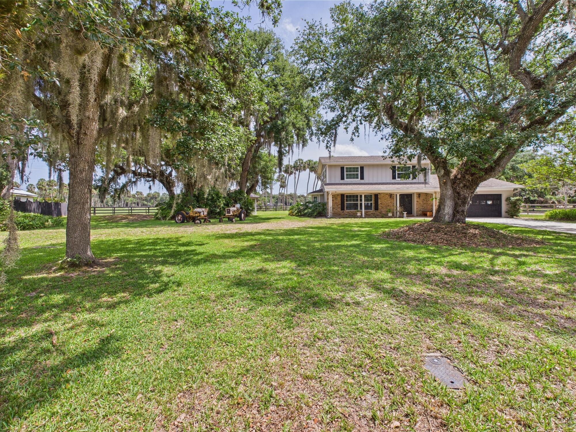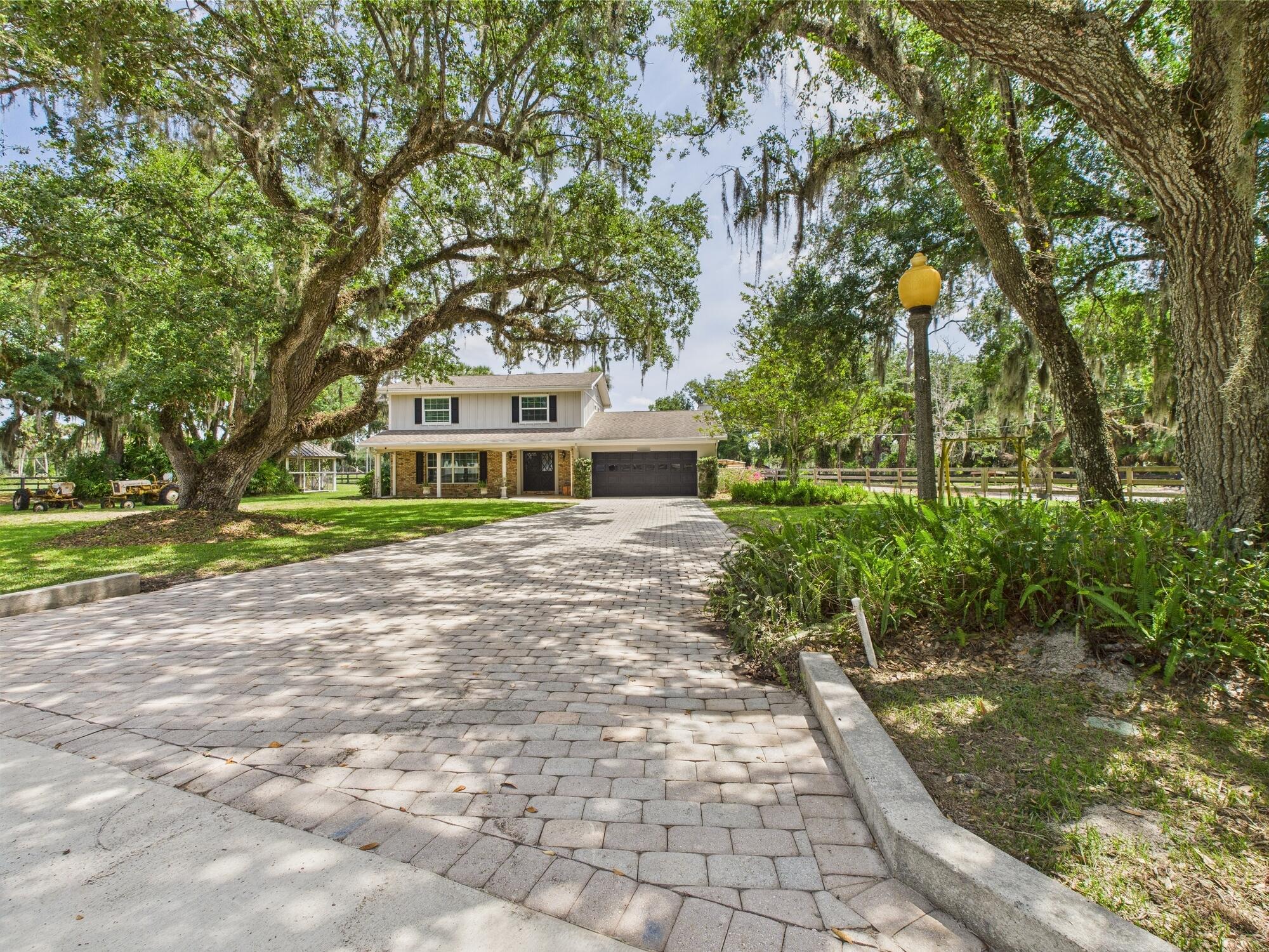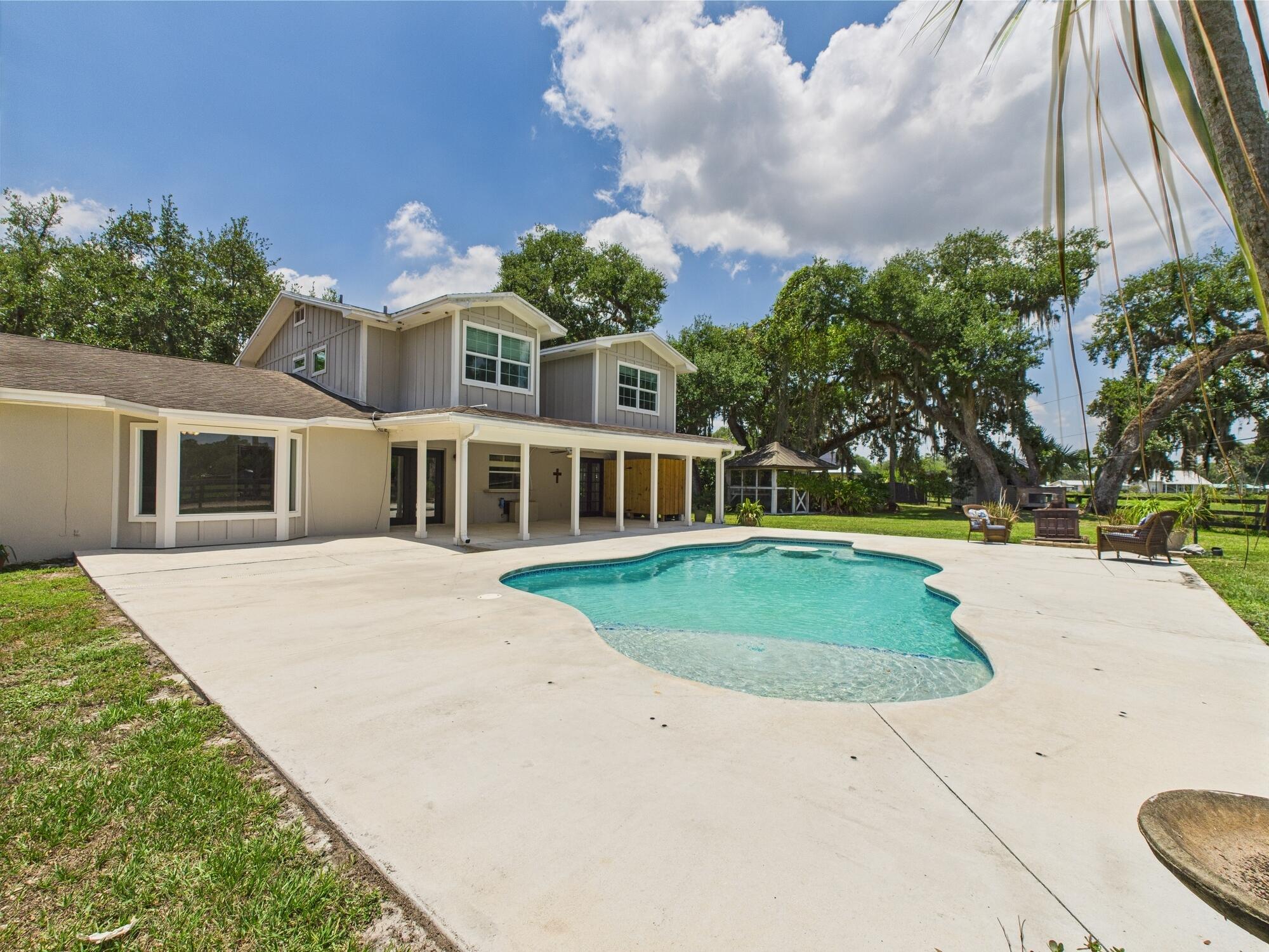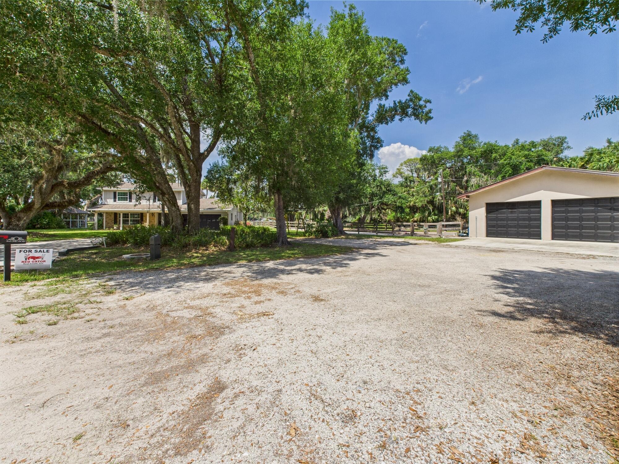 Tucked away on a cul-de-sac in Okeechobee's desirable southwest section, this one-of-a-kind 3BD/2BA two-story home sits on four lots with 2,863 sq. ft. of living space with 5,578 total sq. ft. It features a spacious master suite, formal foyer, living and dining rooms, a chef's kitchen with breezeway window, and a cozy family room with a stone fireplace. The main house has an attached two-car garage, plus there's a massive 2,200 sq. ft. detached garage with a finished office and a partially finished bathroom. Enjoy the NEW 2022 heated pool, two stables, a winding paddock, impact windows upstairs and shutters down, and plenty of room for all your toys.