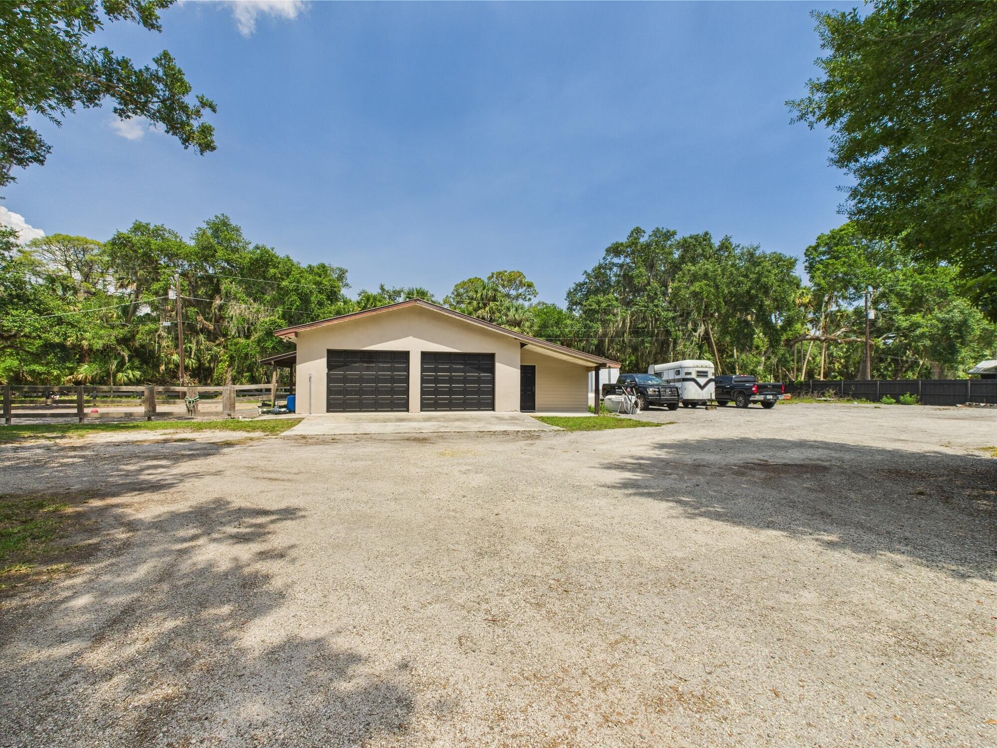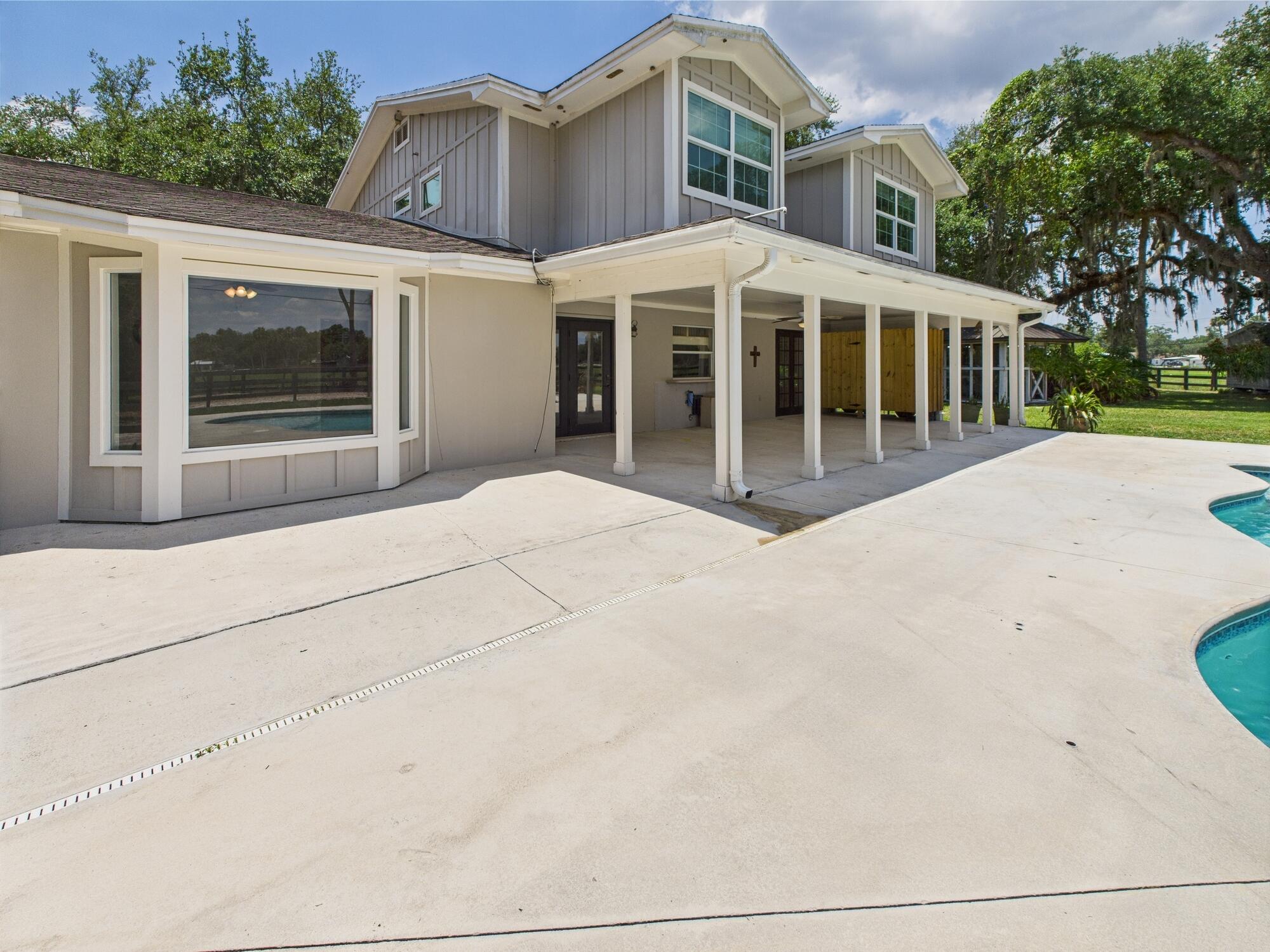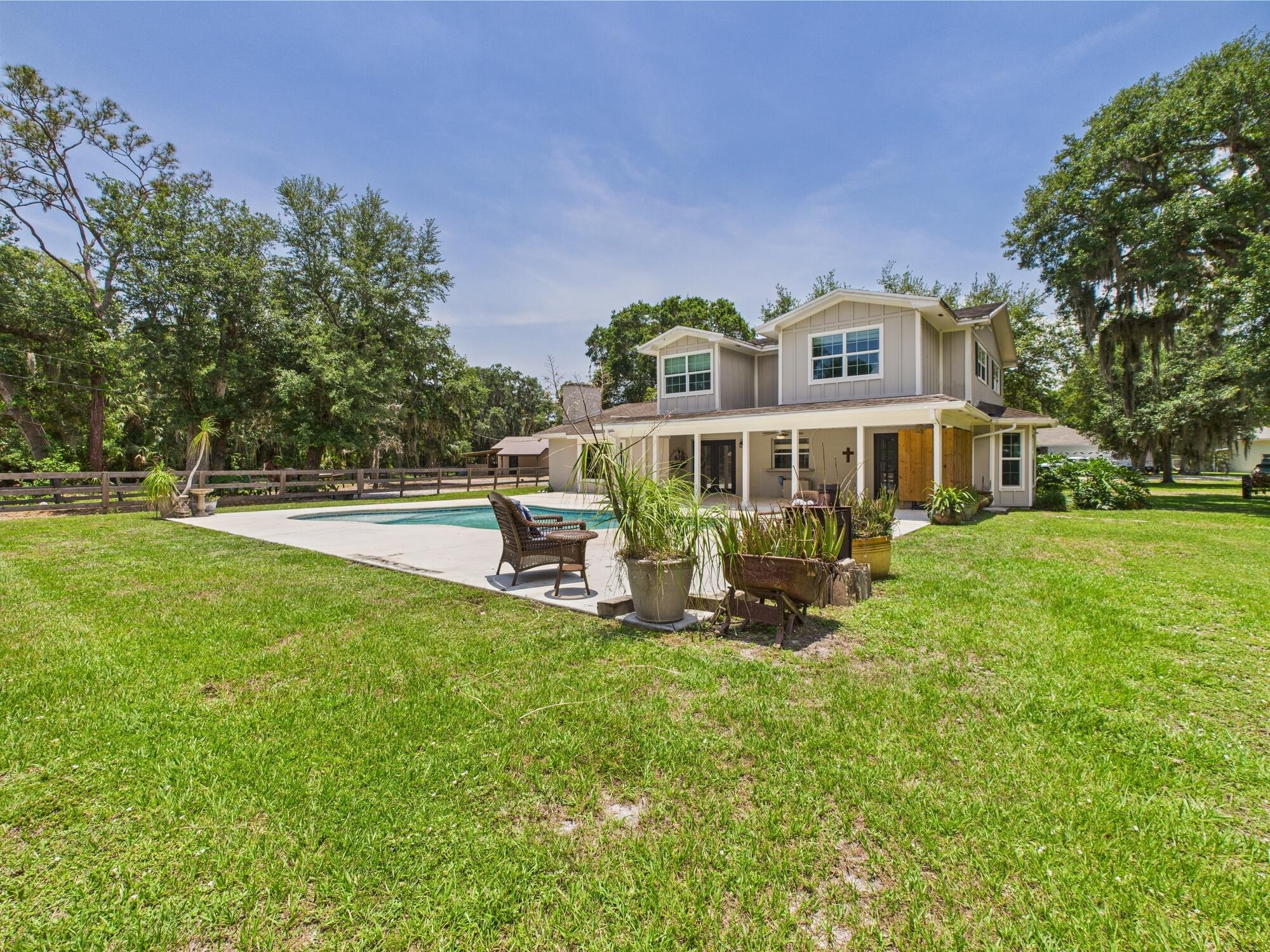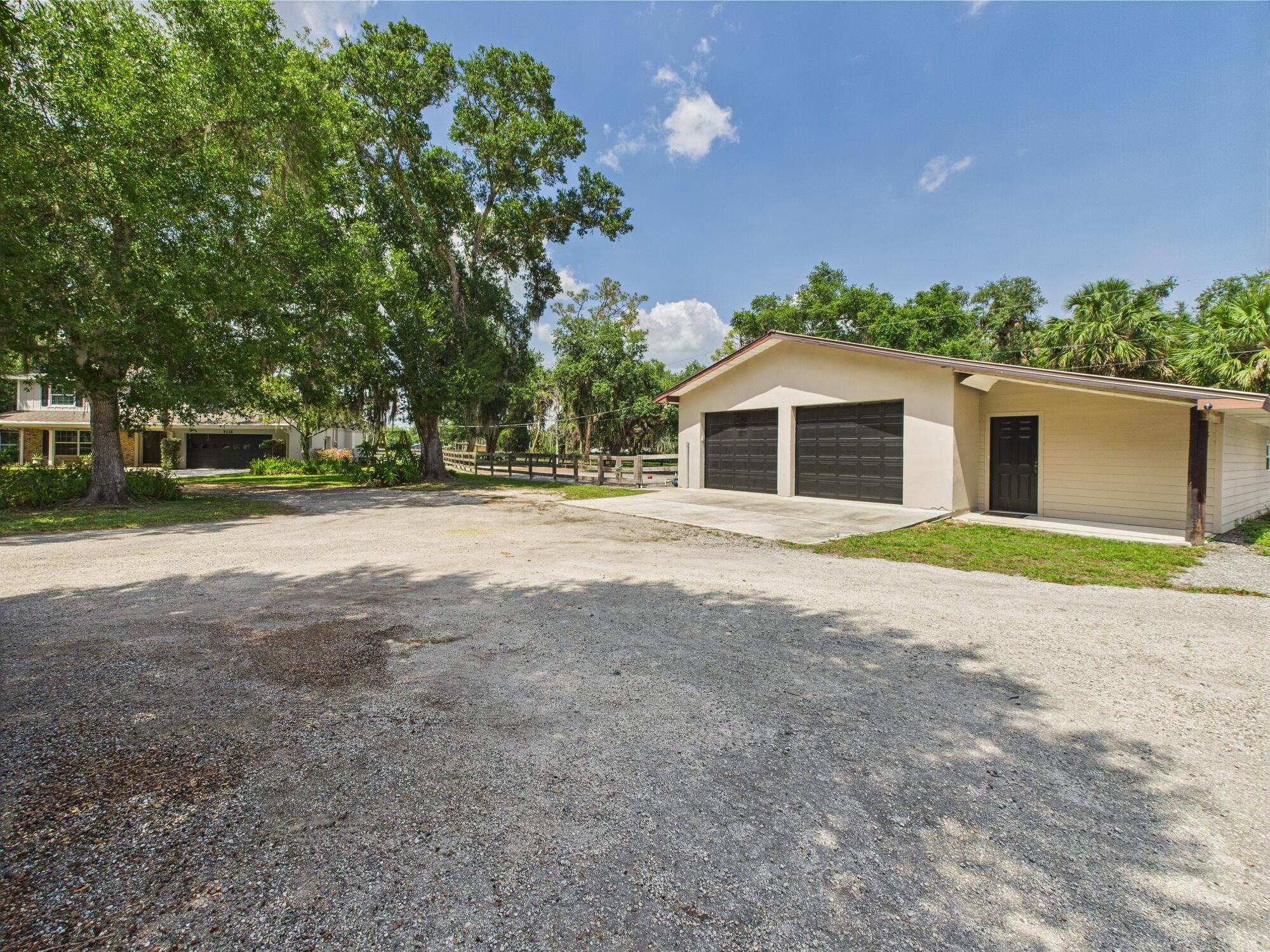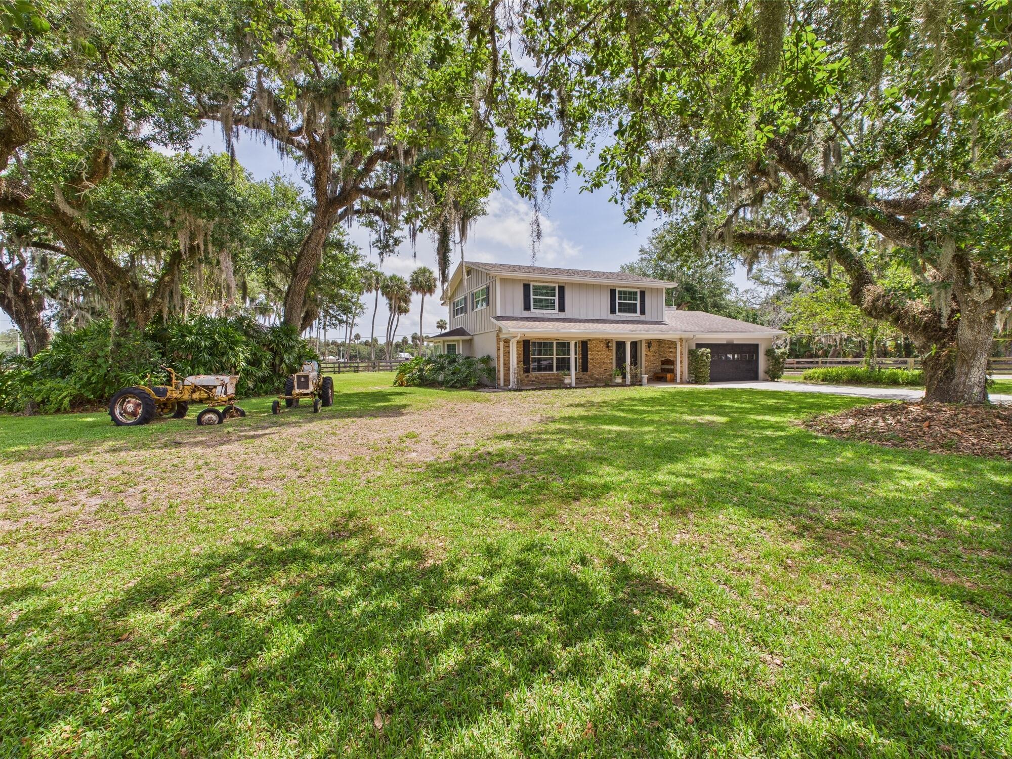 Tucked away on a cul-de-sac in Okeechobee's desirable southwest section, this one-of-a-kind 3BD/2BA two-story home sits on four lots with 2,863 sq. ft. of living space with 5,578 total sq. ft. It features a spacious master suite, formal foyer, living and dining rooms, a chef's kitchen with breezeway window, and a cozy family room with a stone fireplace. The main house has an attached two-car garage, plus there's a massive 2,200 sq. ft. detached garage with a finished office and a partially finished bathroom. Enjoy the NEW 2022 heated pool, two stables, a winding paddock, impact windows upstairs and shutters down, and plenty of room for all your toys.