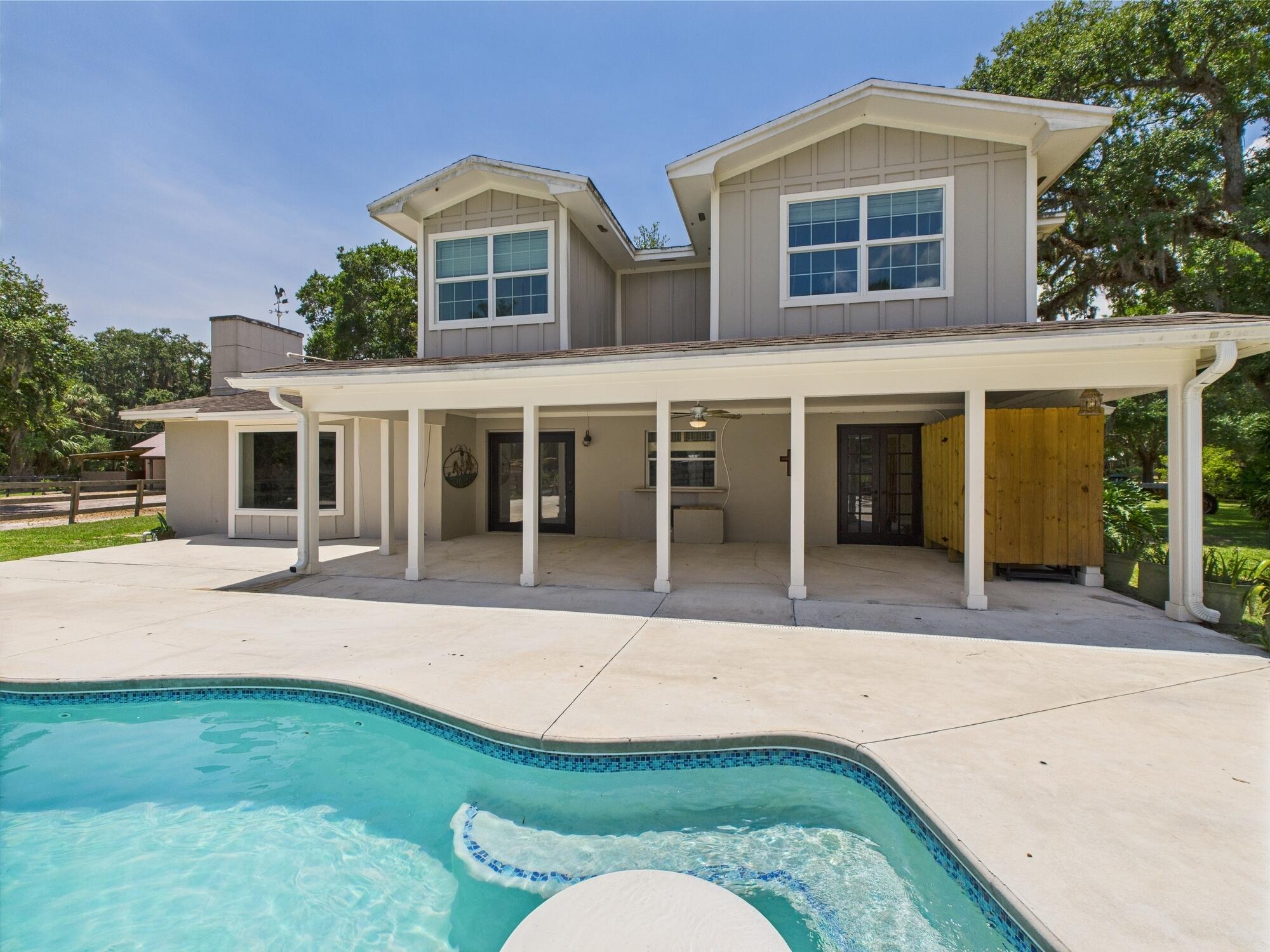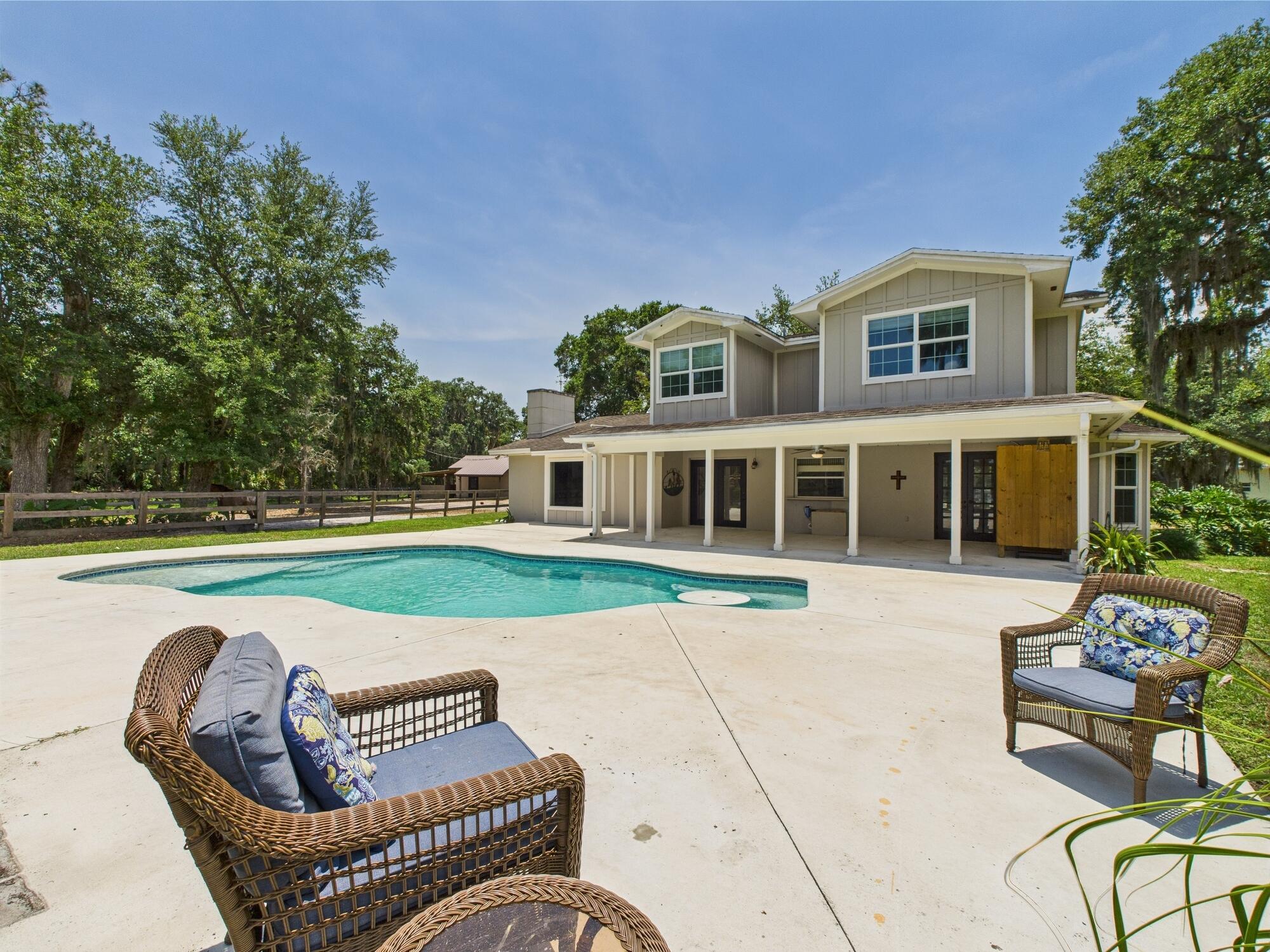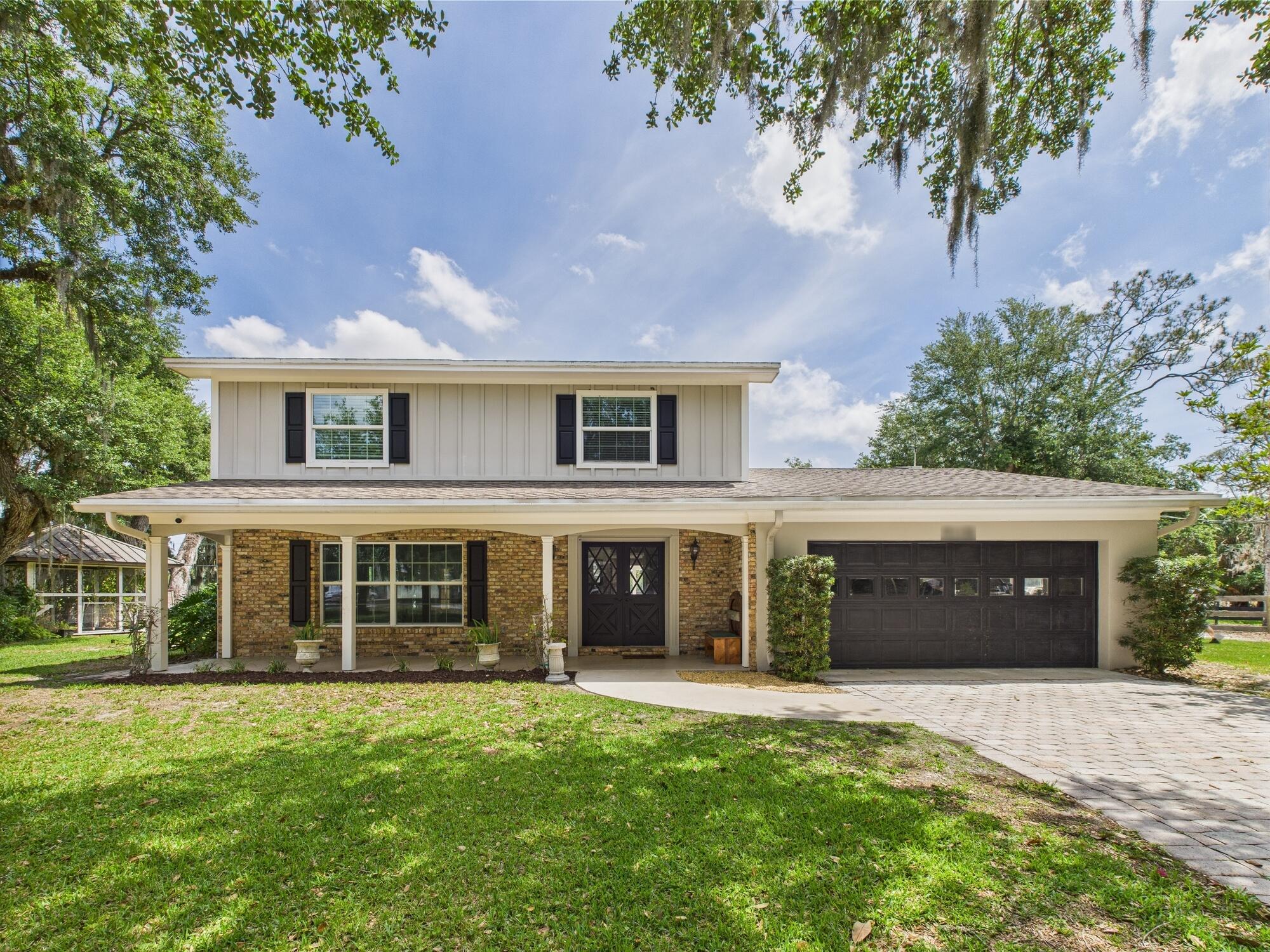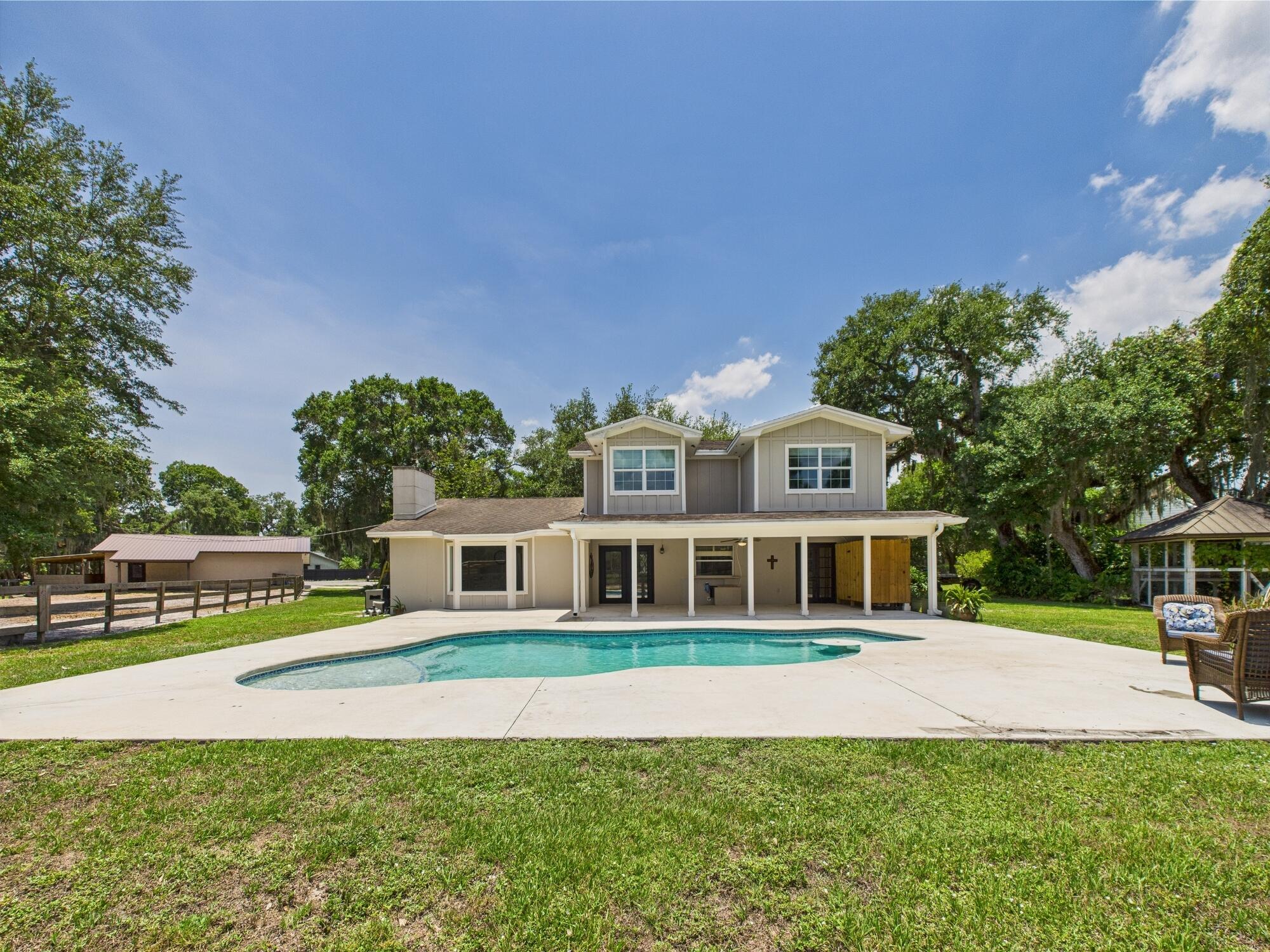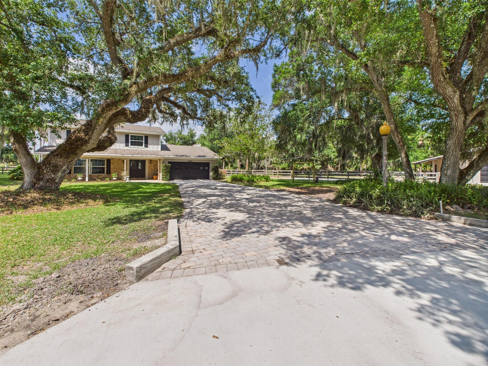 Tucked away on a cul-de-sac in Okeechobee's desirable southwest section, this one-of-a-kind 3BD/2BA two-story home sits on four lots with 2,863 sq. ft. of living space with 5,578 total sq. ft. It features a spacious master suite, formal foyer, living and dining rooms, a chef's kitchen with breezeway window, and a cozy family room with a stone fireplace. The main house has an attached two-car garage, plus there's a massive 2,200 sq. ft. detached garage with a finished office and a partially finished bathroom. Enjoy the NEW 2022 heated pool, two stables, a winding paddock, impact windows upstairs and shutters down, and plenty of room for all your toys.