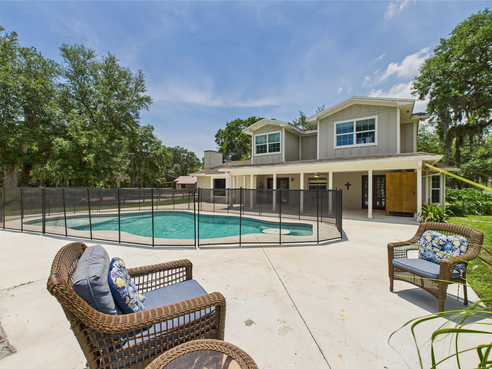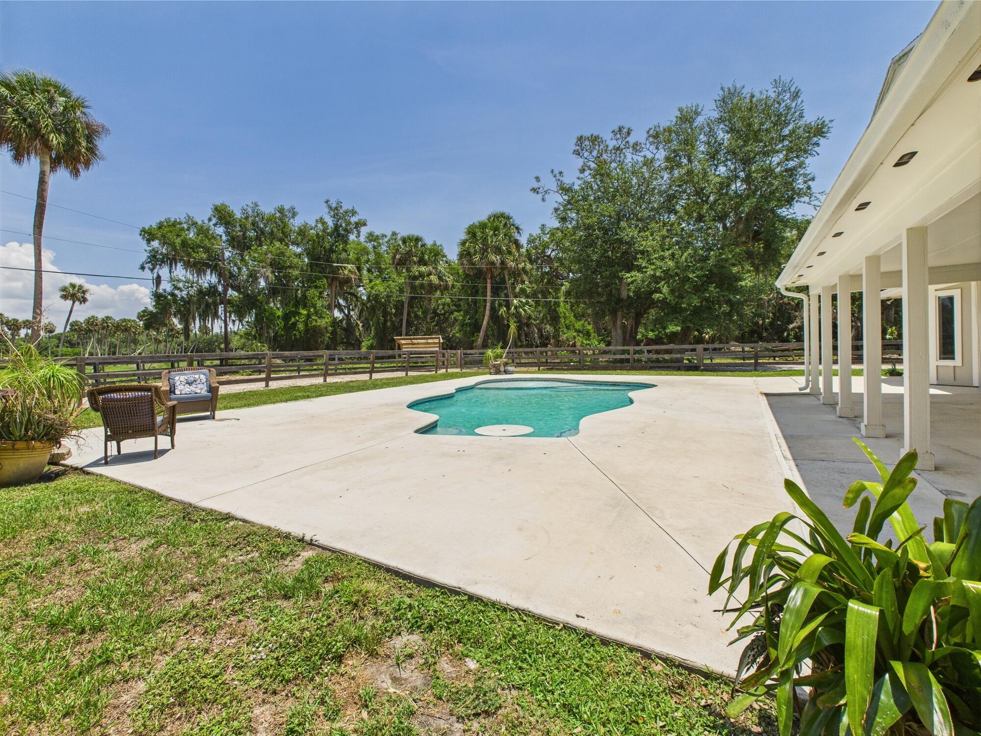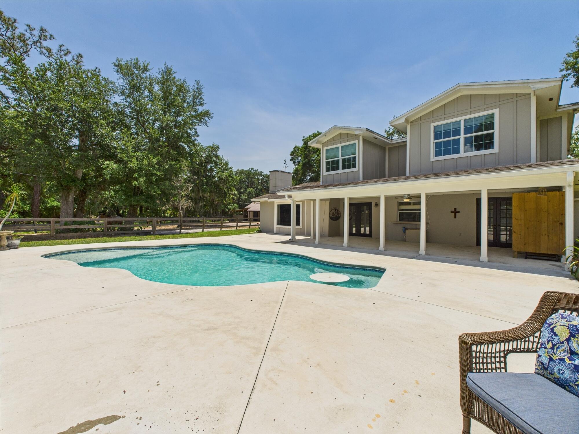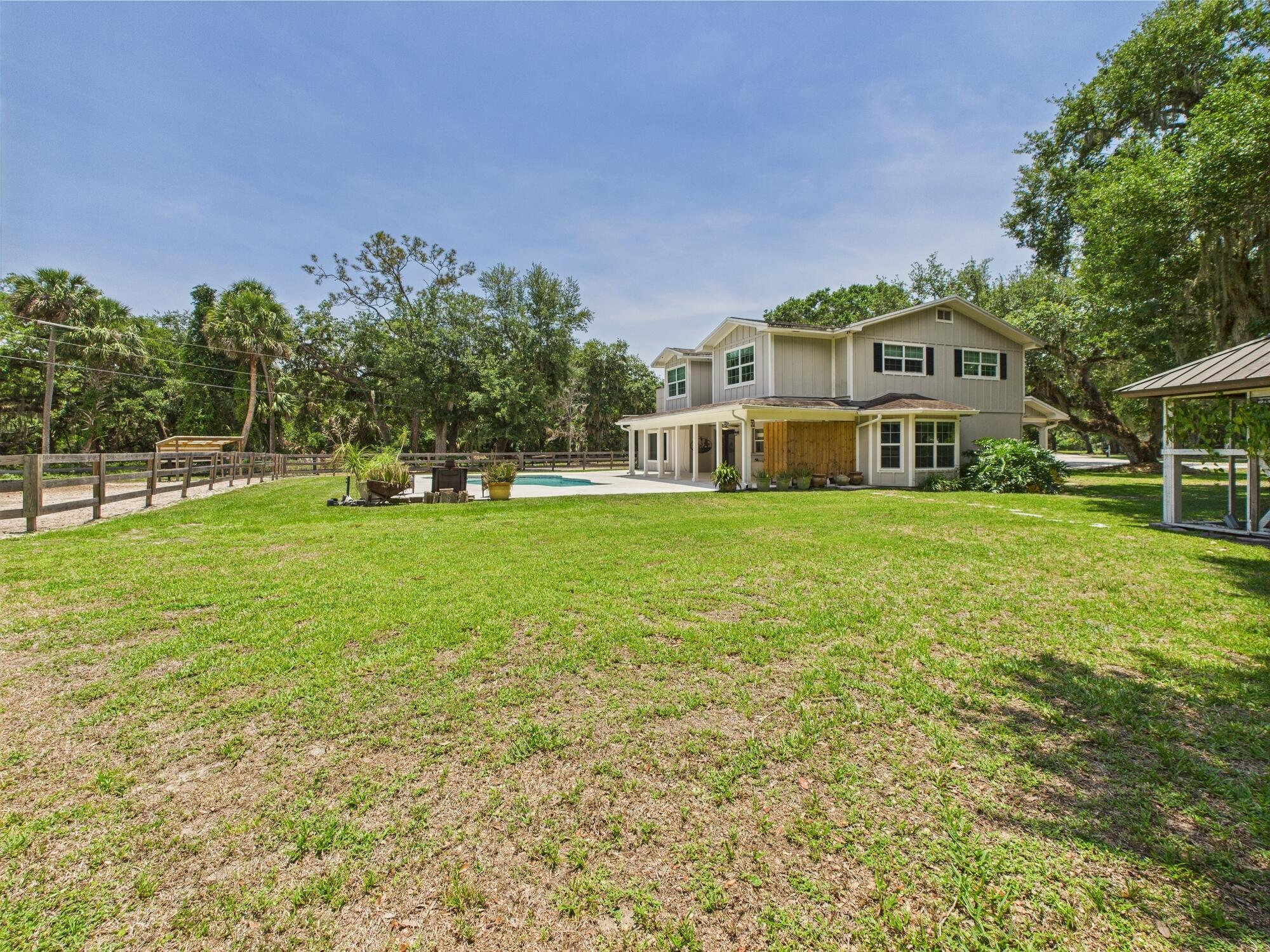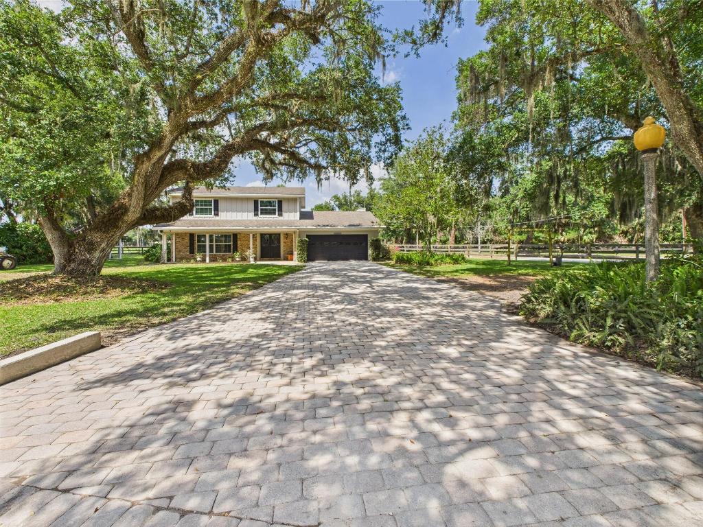 Tucked away on a cul-de-sac in Okeechobee's desirable southwest section, this one-of-a-kind 3BD/2BA two-story home sits on four lots with 2,863 sq. ft. of living space with 5,578 total sq. ft. It features a spacious master suite, formal foyer, living and dining rooms, a chef's kitchen with breezeway window, and a cozy family room with a stone fireplace. The main house has an attached two-car garage, plus there's a massive 2,200 sq. ft. detached garage with a finished office and a partially finished bathroom. Enjoy the NEW 2022 heated pool, two stables, a winding paddock, impact windows upstairs and shutters down, and plenty of room for all your toys.