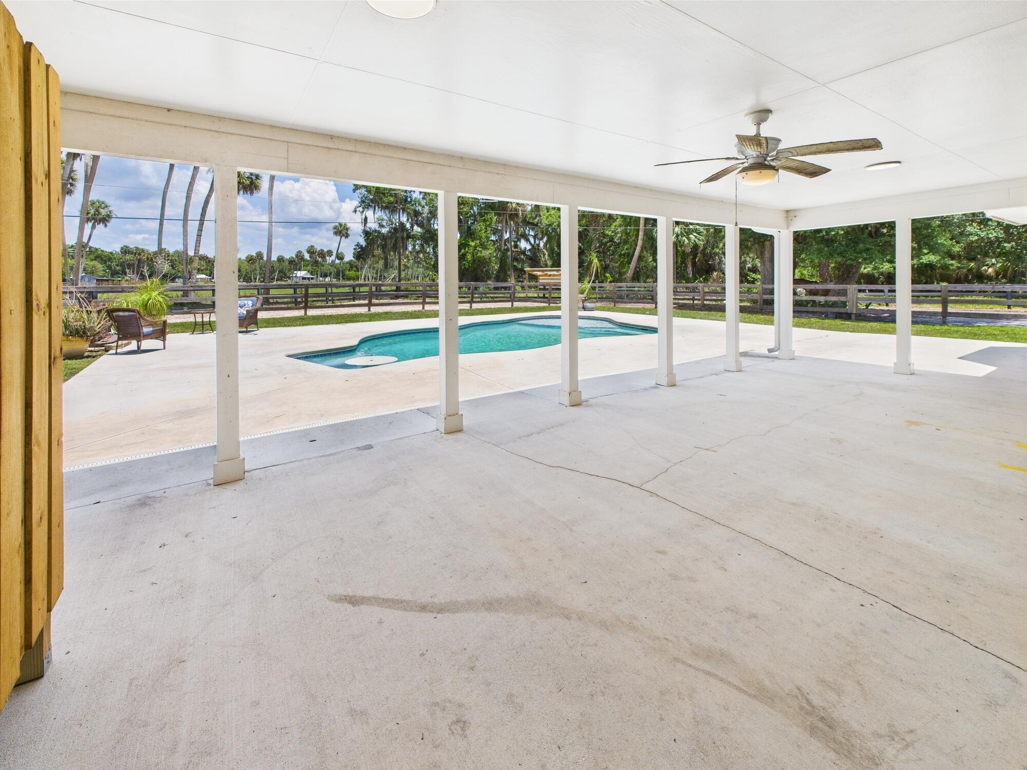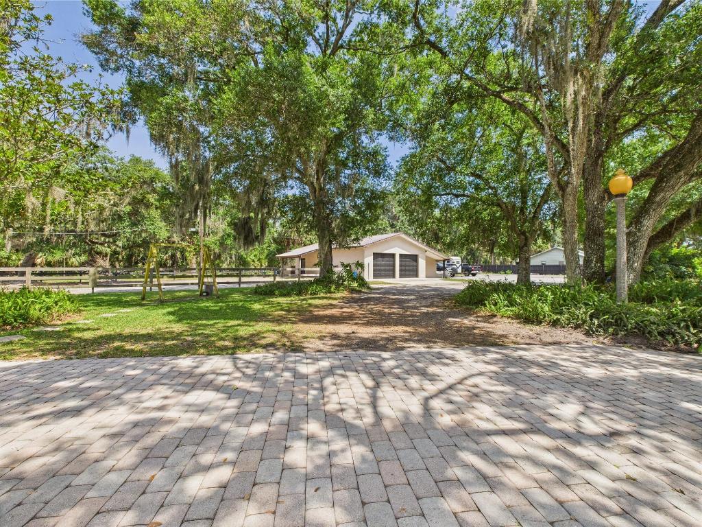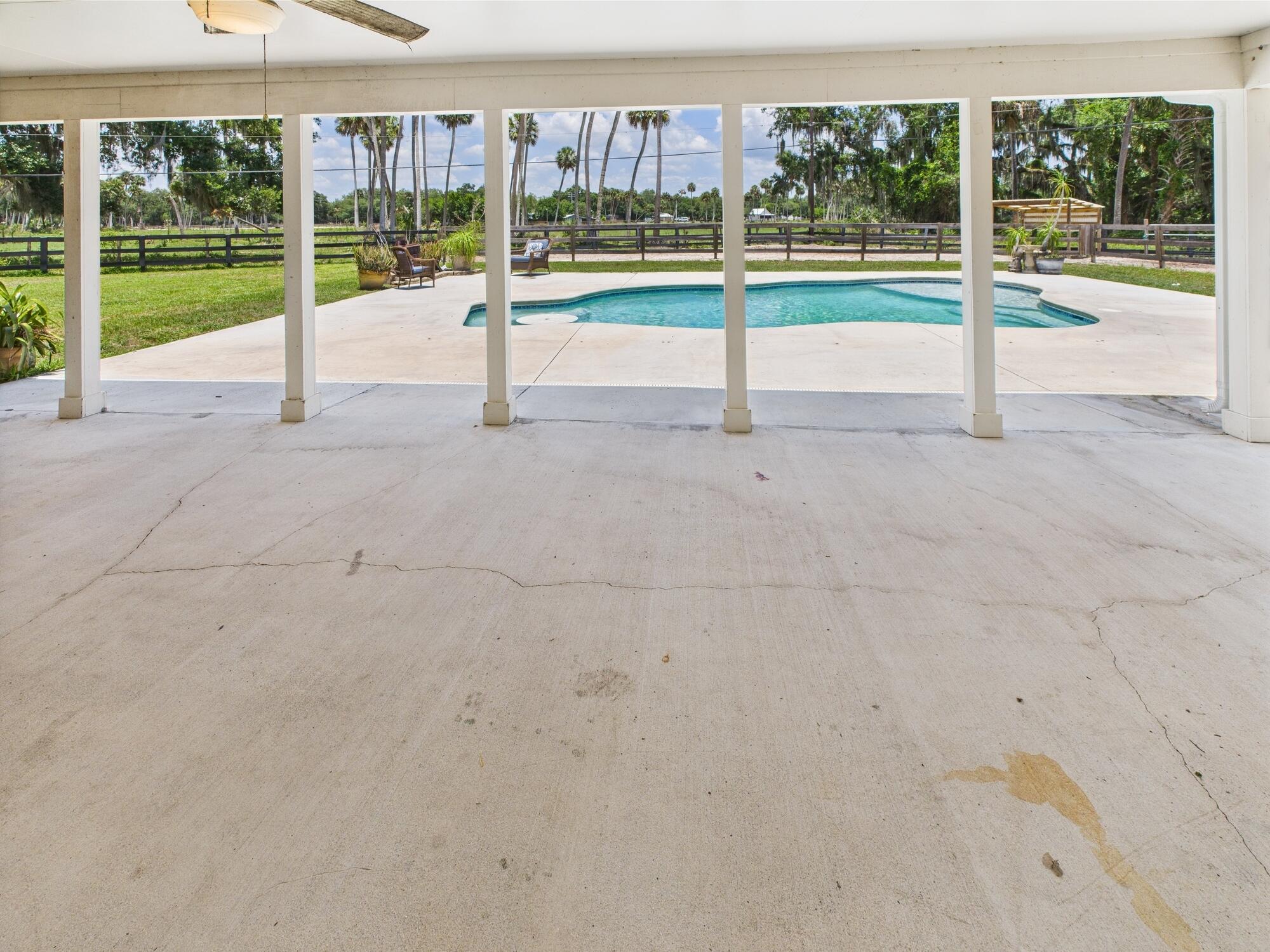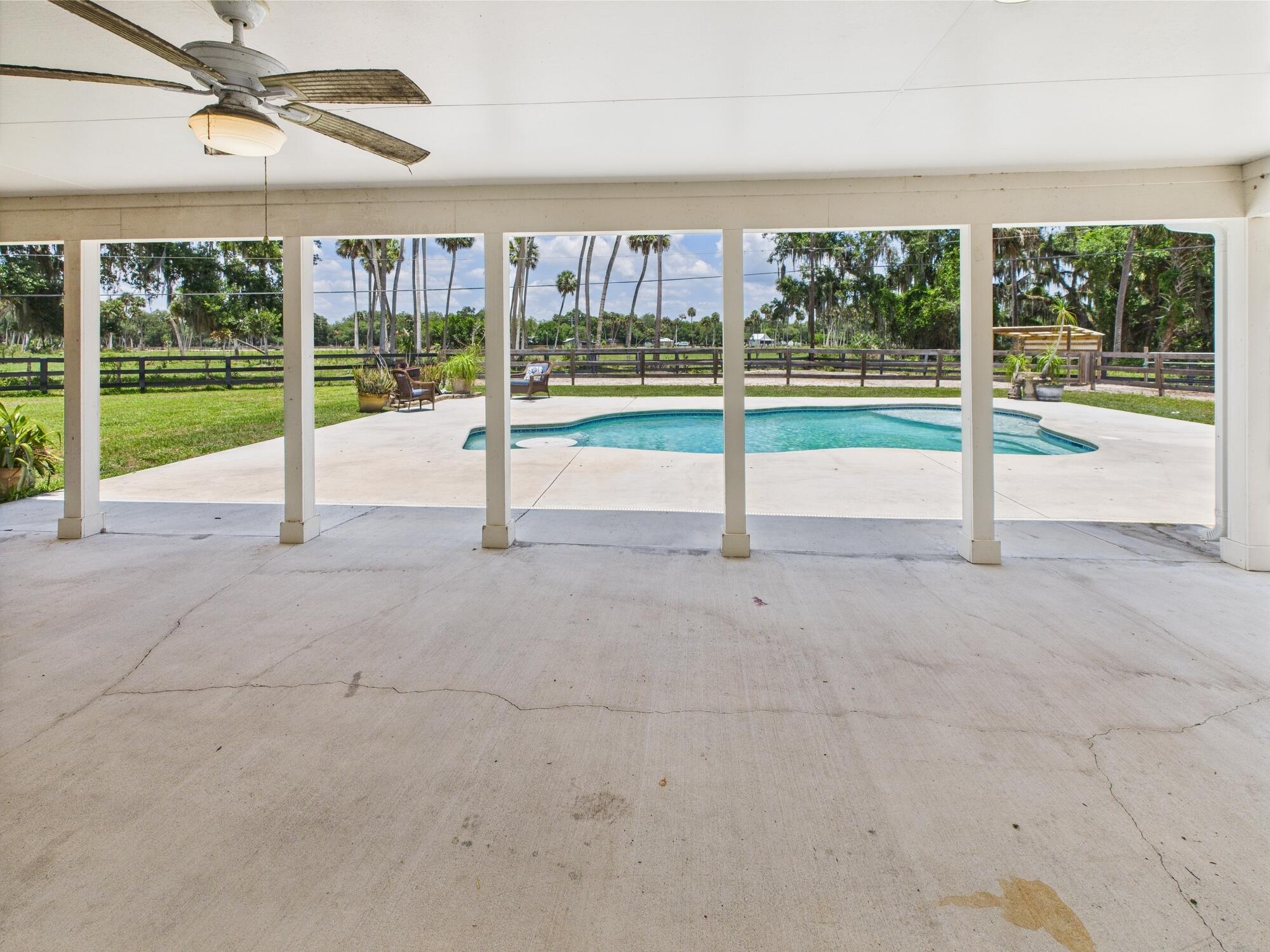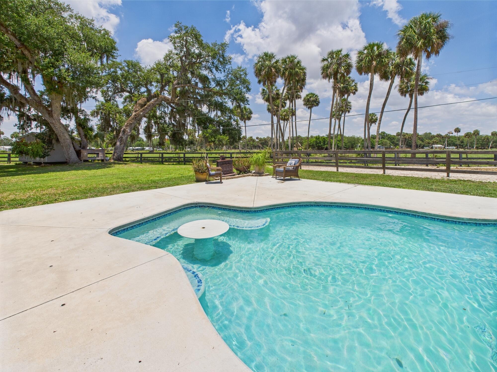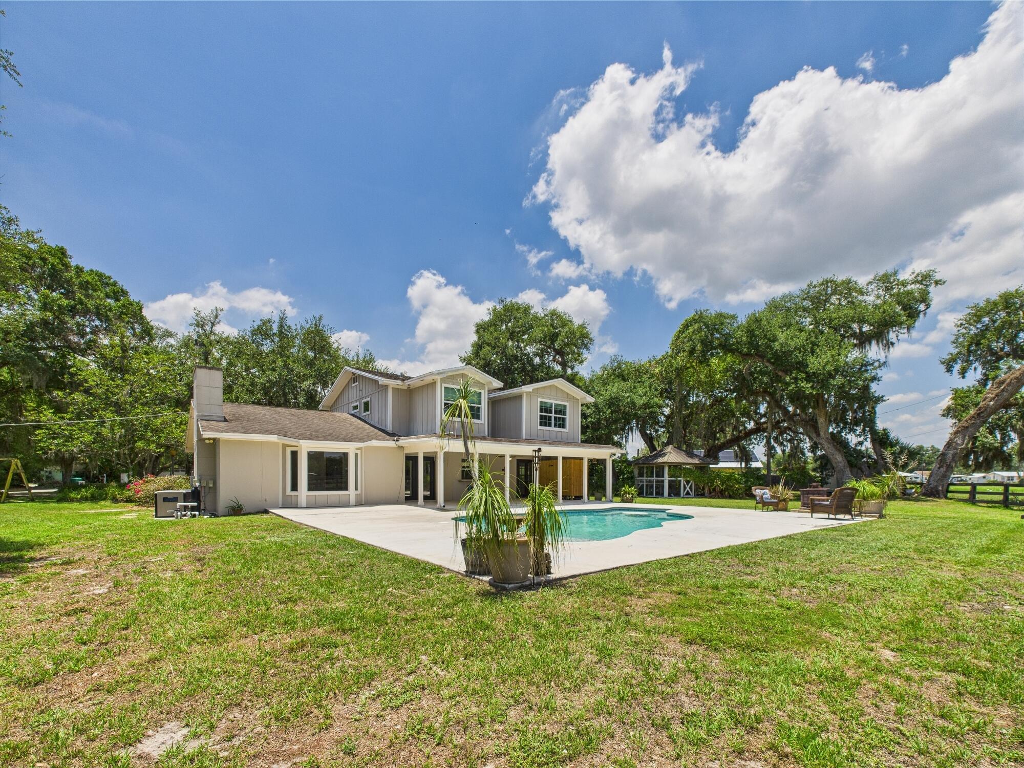 Tucked away on a cul-de-sac in Okeechobee's desirable southwest section, this one-of-a-kind 3BD/2BA two-story home sits on four lots with 2,863 sq. ft. of living space with 5,578 total sq. ft. It features a spacious master suite, formal foyer, living and dining rooms, a chef's kitchen with breezeway window, and a cozy family room with a stone fireplace. The main house has an attached two-car garage, plus there's a massive 2,200 sq. ft. detached garage with a finished office and a partially finished bathroom. Enjoy the NEW 2022 heated pool, two stables, a winding paddock, impact windows upstairs and shutters down, and plenty of room for all your toys.