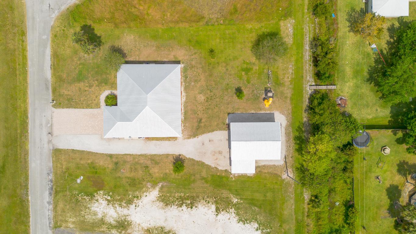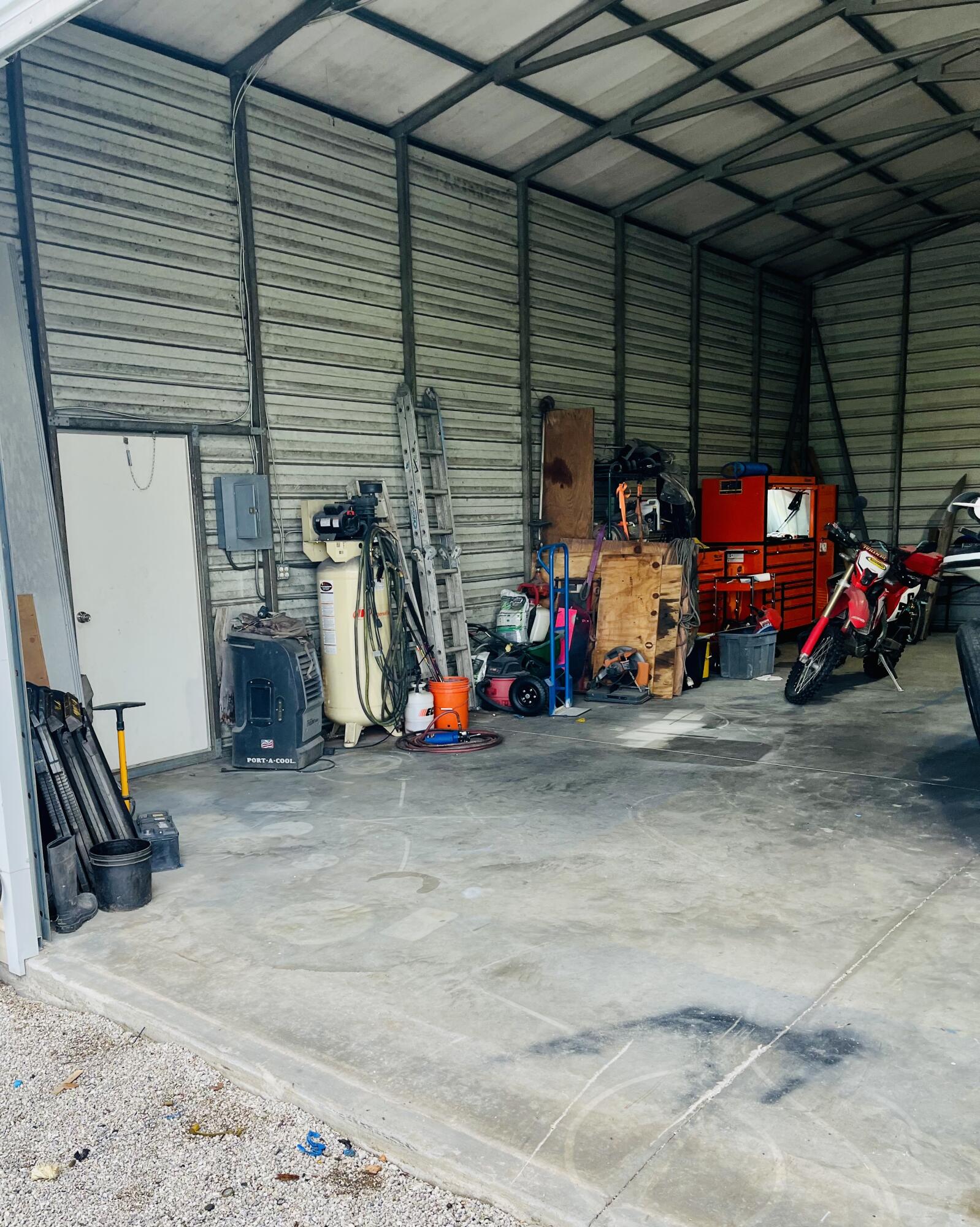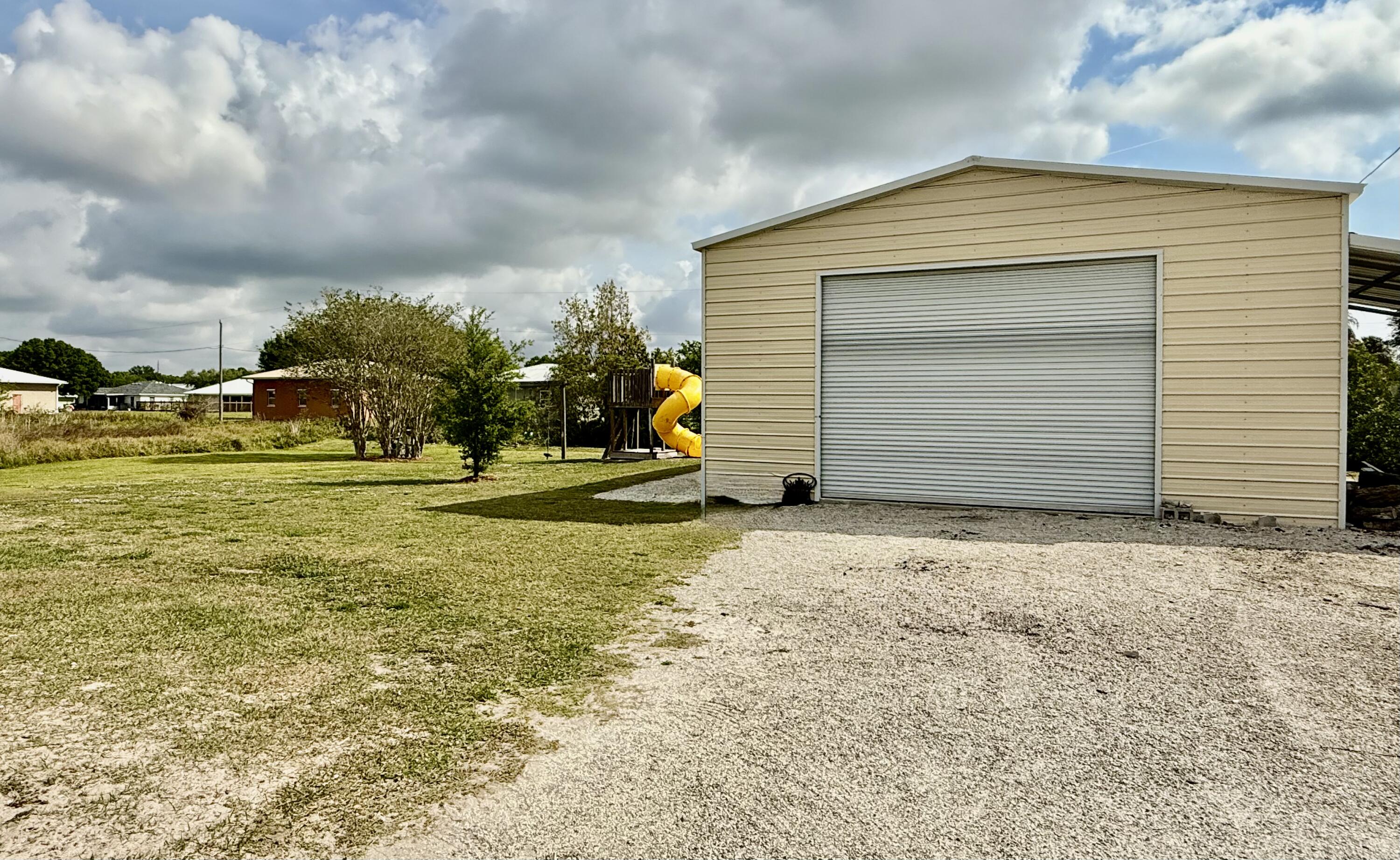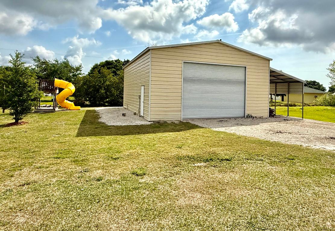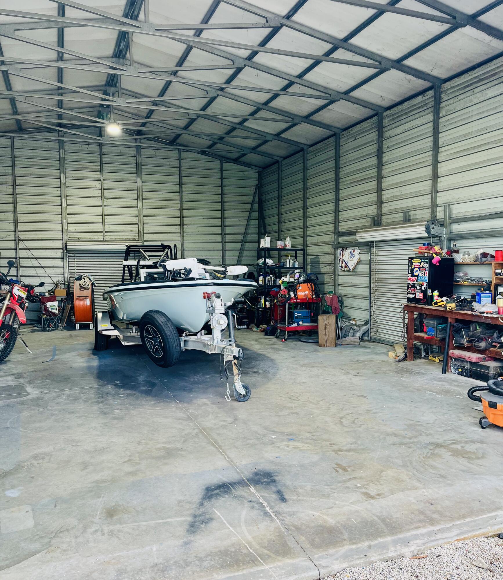 Situated on a half-acre lot, this property boasts 4 bedrooms and 2 bathrooms. The interior features beautiful hickory cabinets complemented by durable Corian countertops. With 1,871 square feet of living space within a total of 3,127 square feet, there's plenty of room for family and guests. The open-concept, split floor plan offers both convenience and privacy. On one side, you'll find 3 bedrooms and a full bath, while the other side features a master suite with an oversized bathroom designed for relaxation, including a walk-in shower and a large Jacuzzi tub. French doors from the master suite open onto a generous 57x12 covered back patio, overlooking the backyard and a 40x30 metal shop with a canopy overhang. The expansive family and dining area, located at the heart of the home, also provides access to the back patio through French doors, perfect for entertaining and enjoying the outdoor space.