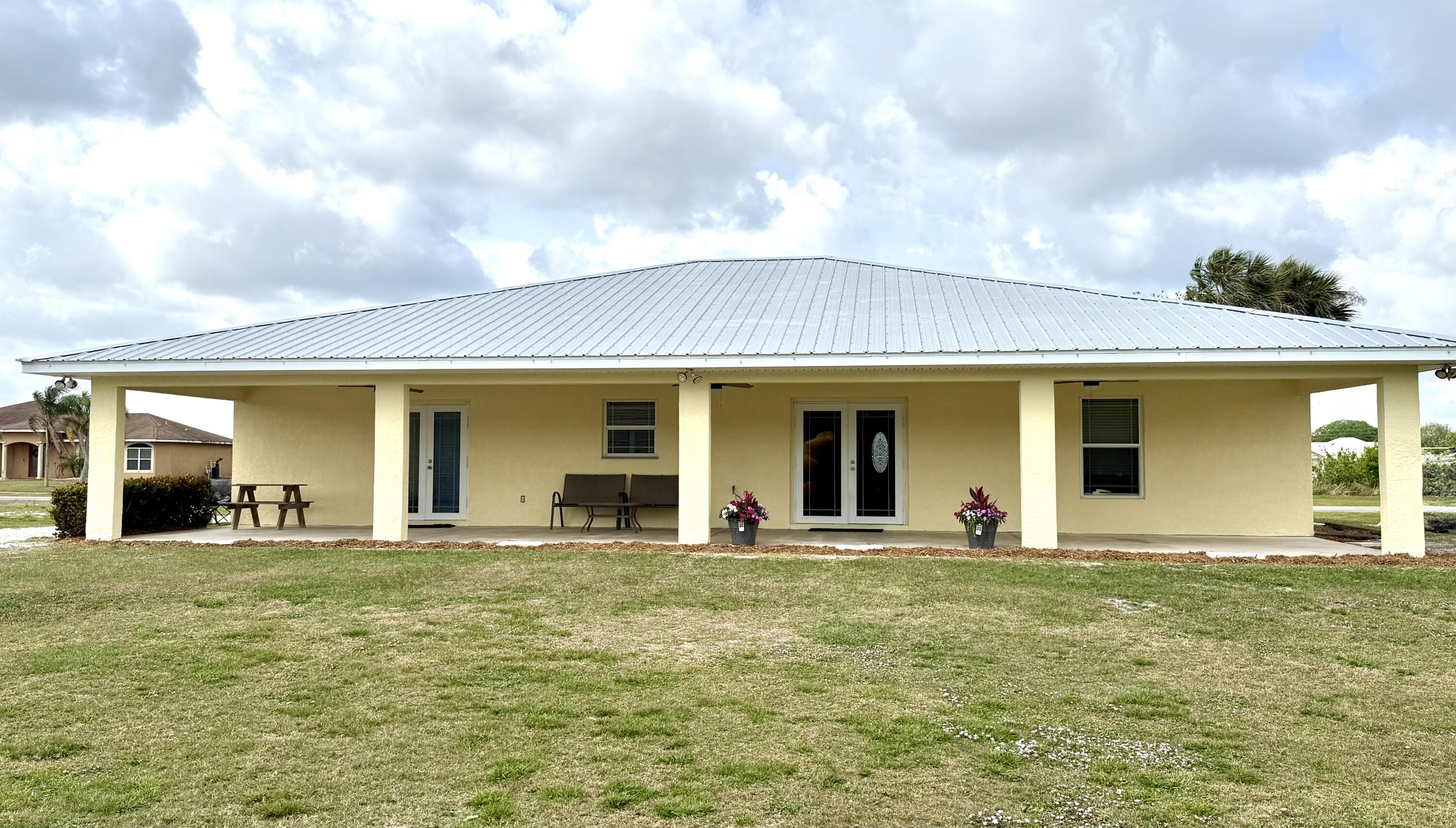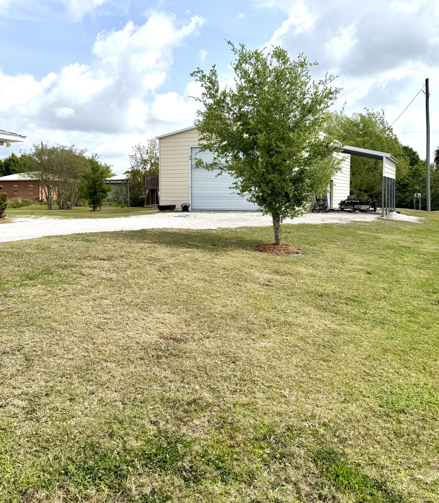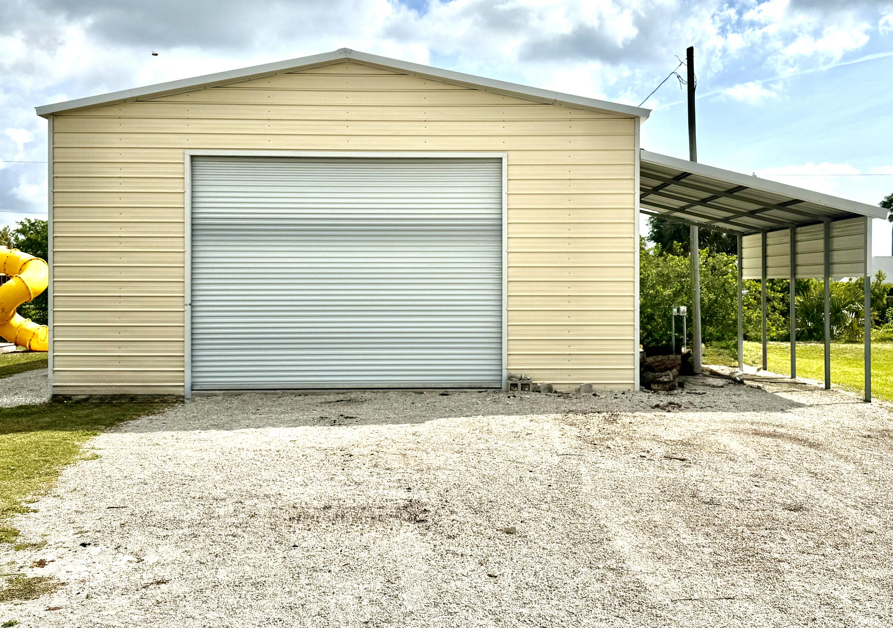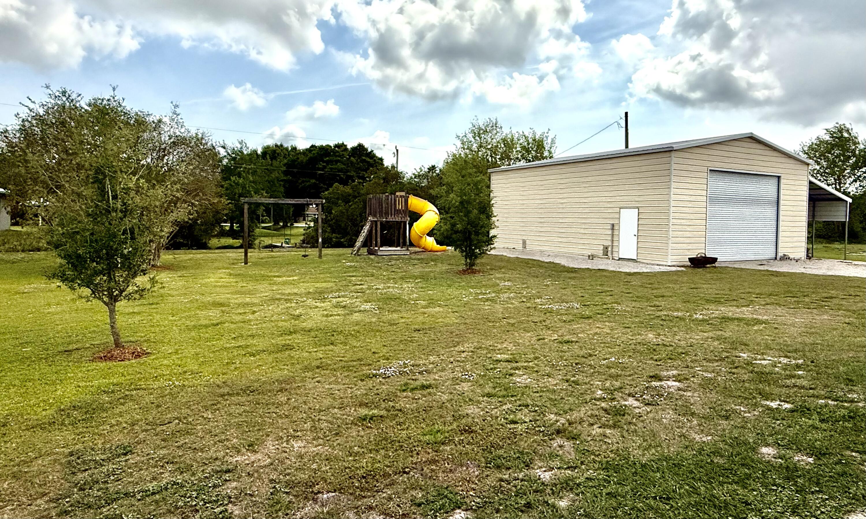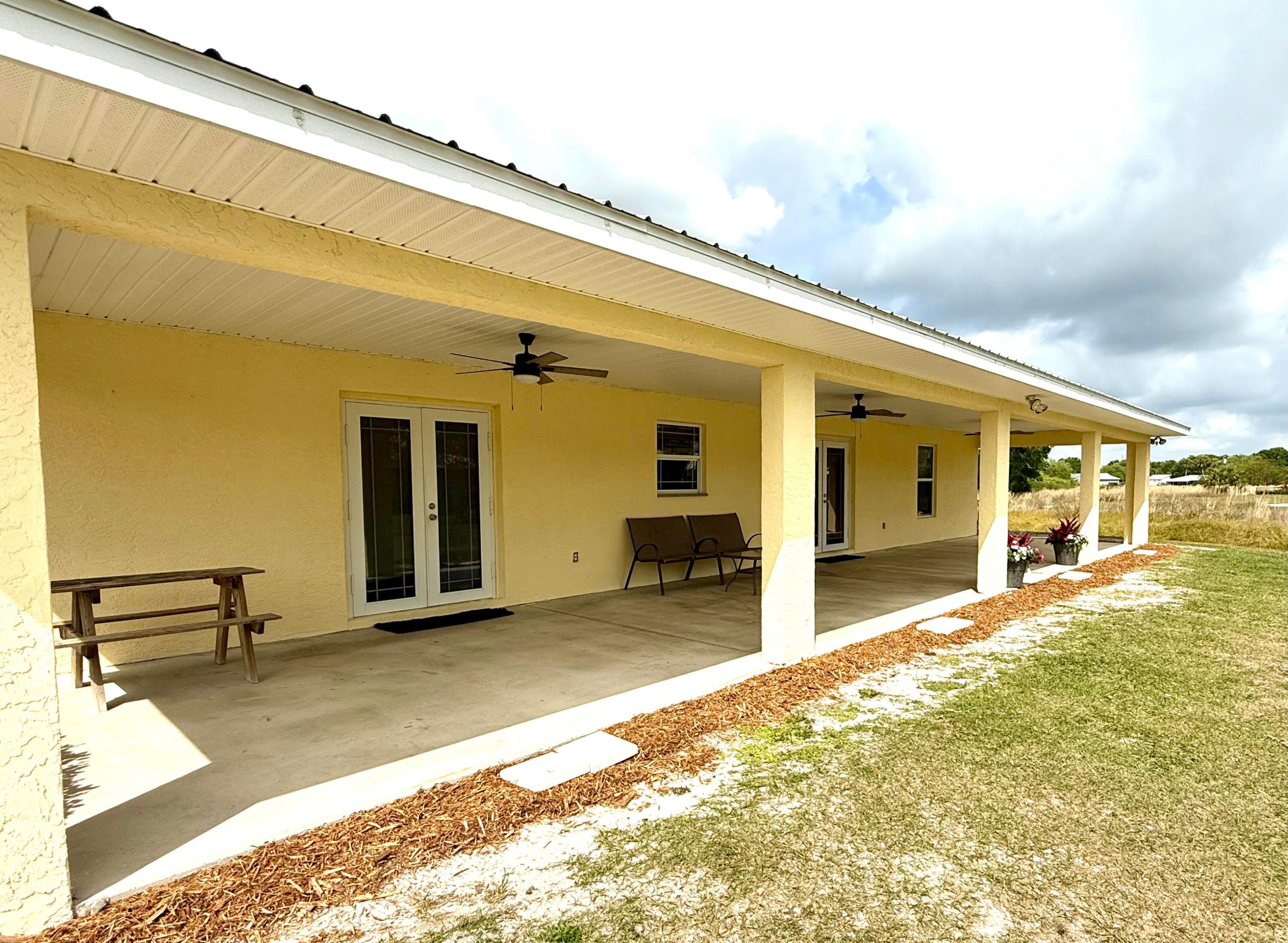 Situated on a half-acre lot, this property boasts 4 bedrooms and 2 bathrooms. The interior features beautiful hickory cabinets complemented by durable Corian countertops. With 1,871 square feet of living space within a total of 3,127 square feet, there's plenty of room for family and guests. The open-concept, split floor plan offers both convenience and privacy. On one side, you'll find 3 bedrooms and a full bath, while the other side features a master suite with an oversized bathroom designed for relaxation, including a walk-in shower and a large Jacuzzi tub. French doors from the master suite open onto a generous 57x12 covered back patio, overlooking the backyard and a 40x30 metal shop with a canopy overhang. The expansive family and dining area, located at the heart of the home, also provides access to the back patio through French doors, perfect for entertaining and enjoying the outdoor space.